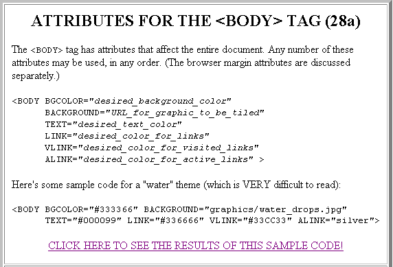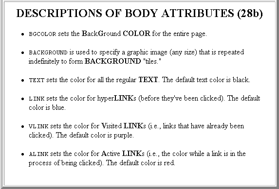 ATTRIBUTES FOR THE <BODY> TAG (28a)<BODY> tag has attributes that affect the entire