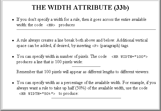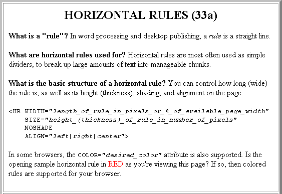 HORIZONTAL RULES (33a)What are horizontal rules used for? Horizontal rules are most often used as simple dividers, to break up large amounts of text into manageable chunks. What is the basic structure of a horizontal rule? You can control how long (wide)