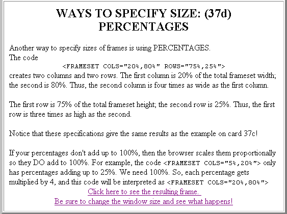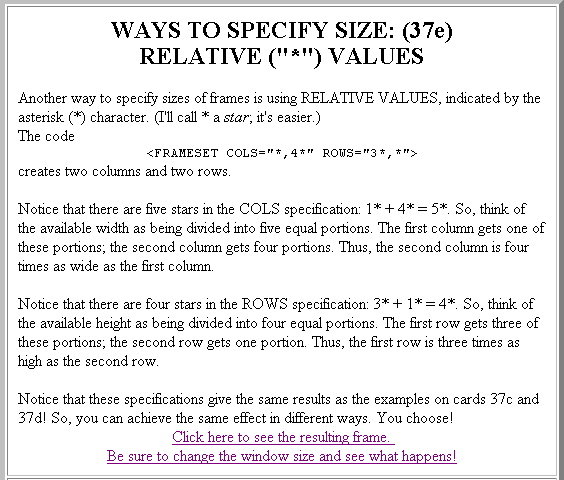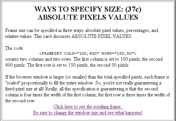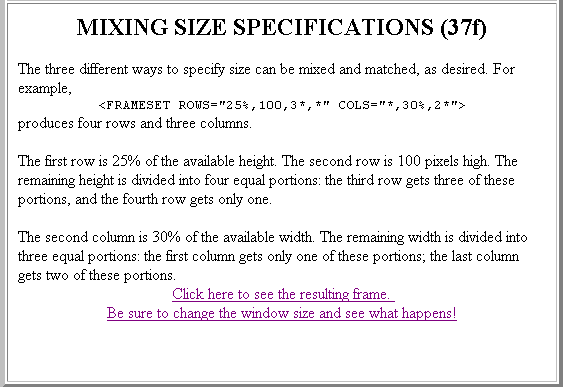 MIXING SIZE SPECIFICATIONS (37f)<FRAMESET ROWS="25%,100,3*,*" COLS="*,30%,2*">The first row is 25% of the available height. The second row is 100 pixels high. The remaining height is divided into four equal portions: the third row gets three of these portions, and the fourth row gets only one. The second column is 30% of the available width. The remaining width is divided into three equal portions: the first column gets only one of these portions; the last column gets two of these portions. Be sure to change the window size and see what happens! |