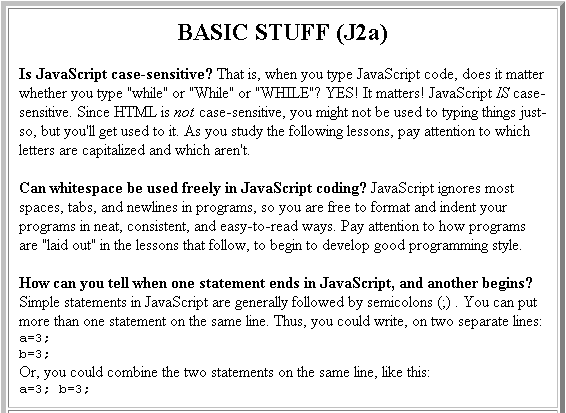 BASIC STUFF (J2a)Can whitespace be used freely in JavaScript coding? JavaScript ignores most spaces, tabs, and newlines in programs, so you are free to format and indent your programs in neat, consistent, and easy-to-read ways. Pay attention to how programs are "laid out" in the lessons that follow, to begin to develop good programming style.