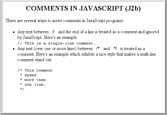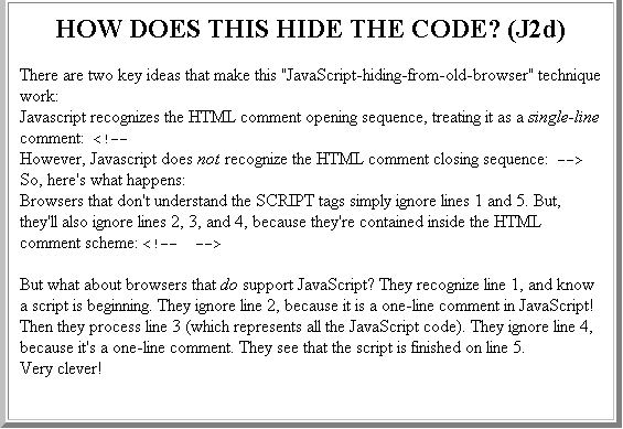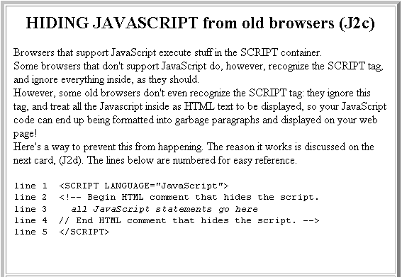 HIDING JAVASCRIPT from old browsers (J2c)Some browsers that don't support JavaScript do, however, recognize the SCRIPT tag, and ignore everything inside, as they should. However, some old browsers don't even recognize the SCRIPT tag: they ignore this tag, and treat all the Javascript inside as HTML text to be displayed, so your JavaScript code can end up being formatted into garbage paragraphs and displayed on your web page! Here's a way to prevent this from happening. The reason it works is discussed on the next card, (J2d). The lines below are numbered for easy reference.