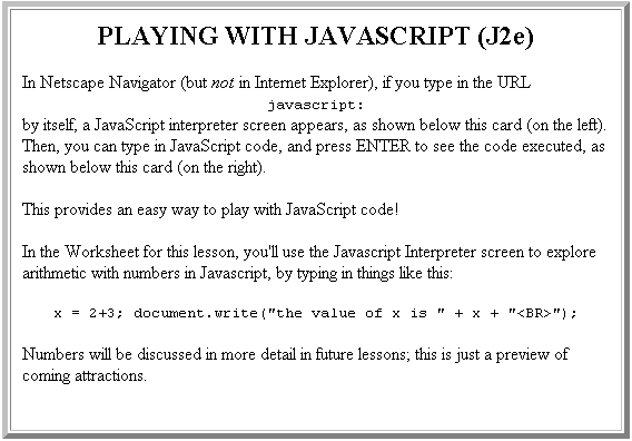PLAYING WITH JAVASCRIPT (J2e)javascript: This provides an easy way to play with JavaScript code! In the Worksheet for this lesson, you'll use the Javascript Interpreter screen to explore arithmetic with numbers in Javascript, by typing in things like this: