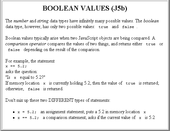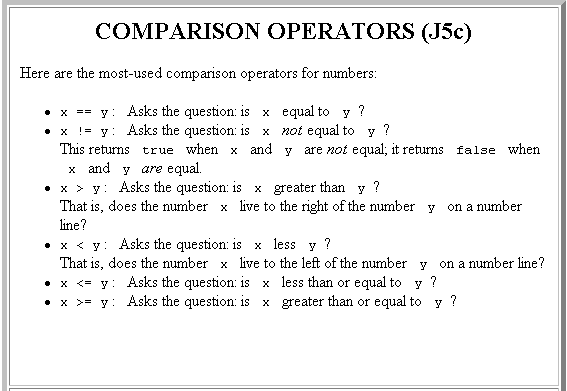 x = 5.2; x = x + 1; document.write("The value of x is " + x + "<BR>");x = 5.2; x = x - 1; document.write("The value of x is " + x + "<BR>");x = 5.2; x = x + 2*x; document.write("The value of x is " + x + "<BR>");x = 5.2; x == 5.2;x = 5.2; x == 6.2;x = 5.2; x == x;x = 5.2; x == x+1;x = 2; y = 3; x == y;x = 2; y = 3; x != y;x = 2; y = 3; x > y;x = 2; y = 3; x < y;x = 2; y = 3; x >= y;x = 2; y = 3; x <= y;x = 4; y = 4; x == y;x = 4; y = 4; x != y;x = 4; y = 4; x > y;x = 4; y = 4; x < y;x = 4; y = 4; x >= y;x = 4; y = 4; x <= y;x = 3; if (x == 3) {y = 1;} else {y = 2;} document.write("the value of y is " + y + "<BR>");x = 4; if (x == 3) {y = 1;} else {y = 2;} document.write("the value of y is " + y + "<BR>");x = 1; y = 2; if (x > 0) {y = y + 1;} else {y = y - 1;} document.write("the value of y is " + y + "<BR>");x = 1; y = 2; if (x < 0) {y = y + 1;} else {y = y - 1;} document.write("the value of y is " + y + "<BR>");<SCRIPT>container, to do the following: